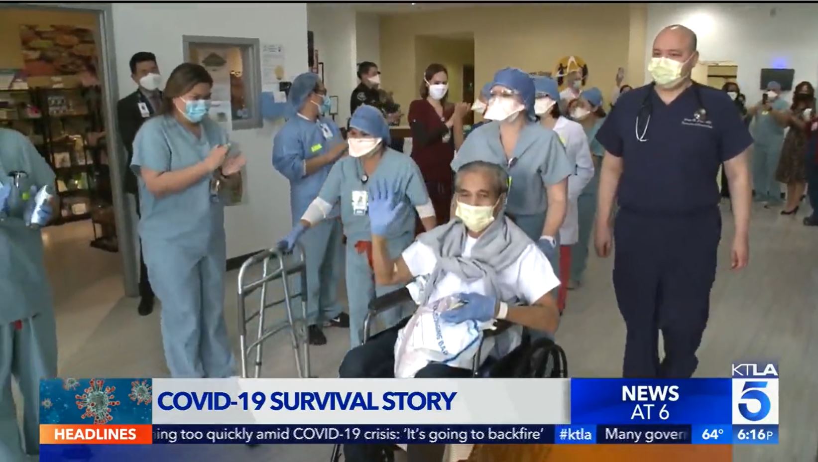 Bệnh nhân Tien Tran lúc rời bệnh viện ở Anaheim. (Hình: KTLA 5)
