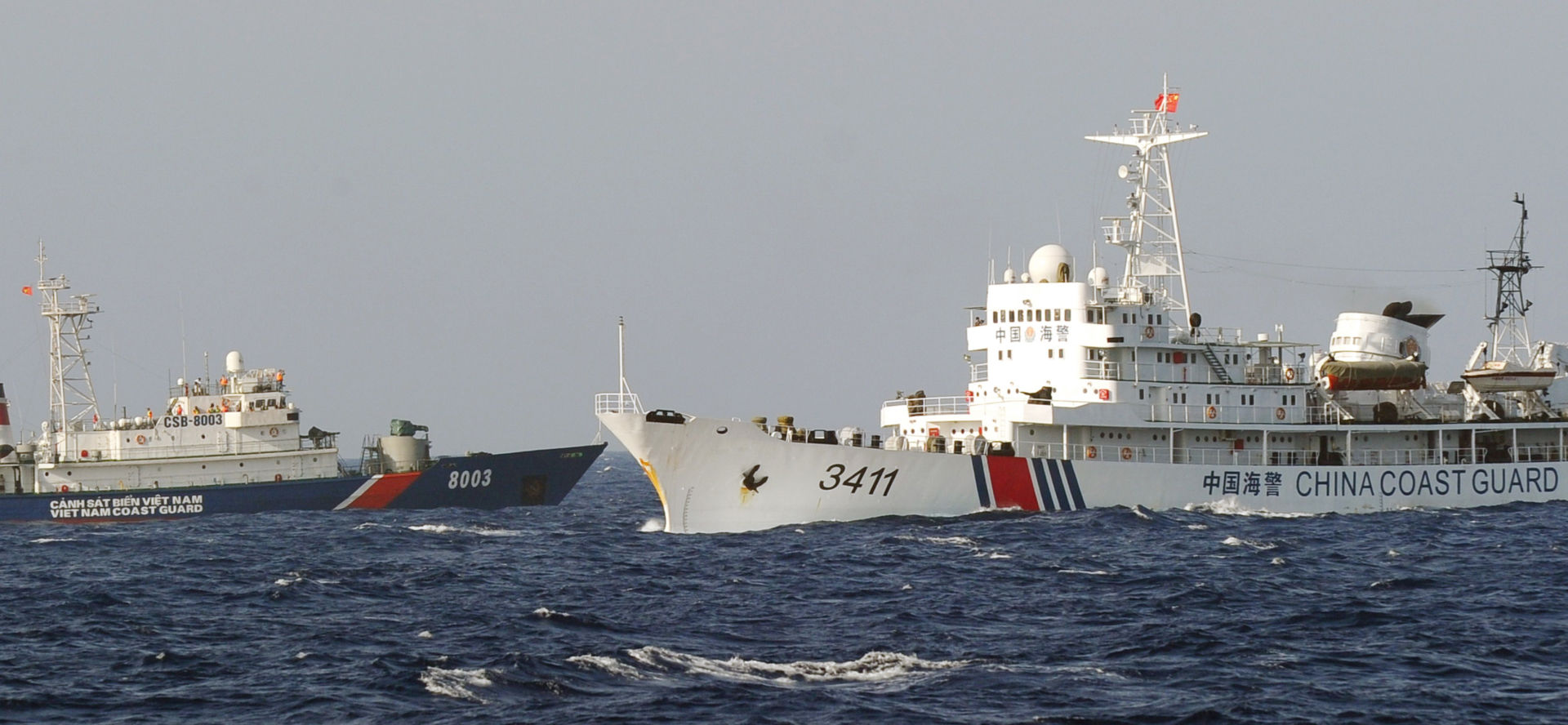 Tàu Cảnh Sát Biển Việt Nam (trái) hiếm khi thấy xuất hiện để bảo vệ ngư dân. (Hình: Hoang Dinh Nam/AFP via Getty Images)