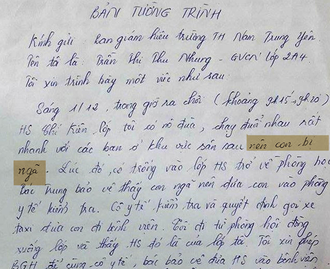 Tiếp tay với bà hiệu trưởng còn có giáo viên chủ nhiệm lớp 2A4 tên là Trần Thị Thu Nhung. Đây là bản tường trình láo khoét của cô giáo này: