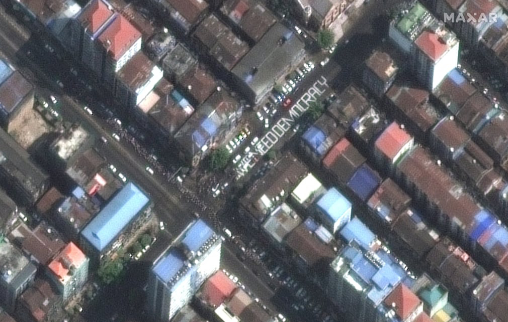 Thông điệp "Chúng tôi cần dân chủ" ở Yangon hồi tháng 2 - Ảnh: MAXAR