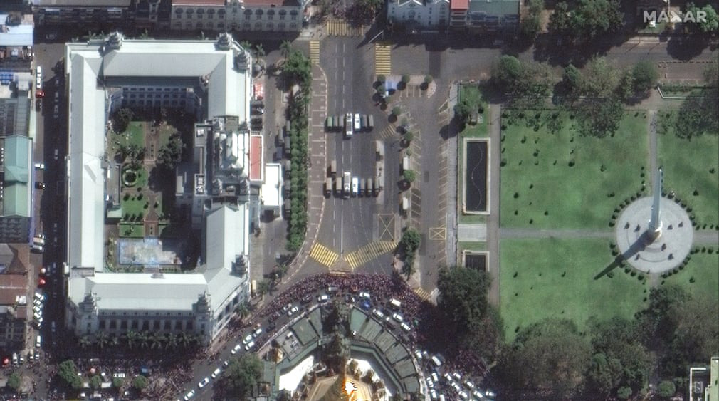 Người biểu tình đổ về khu vực gần tòa thị chính ở Yangon, thành phố lớn nhất Myanmar, hồi tháng 2 - Ảnh: MAXAR