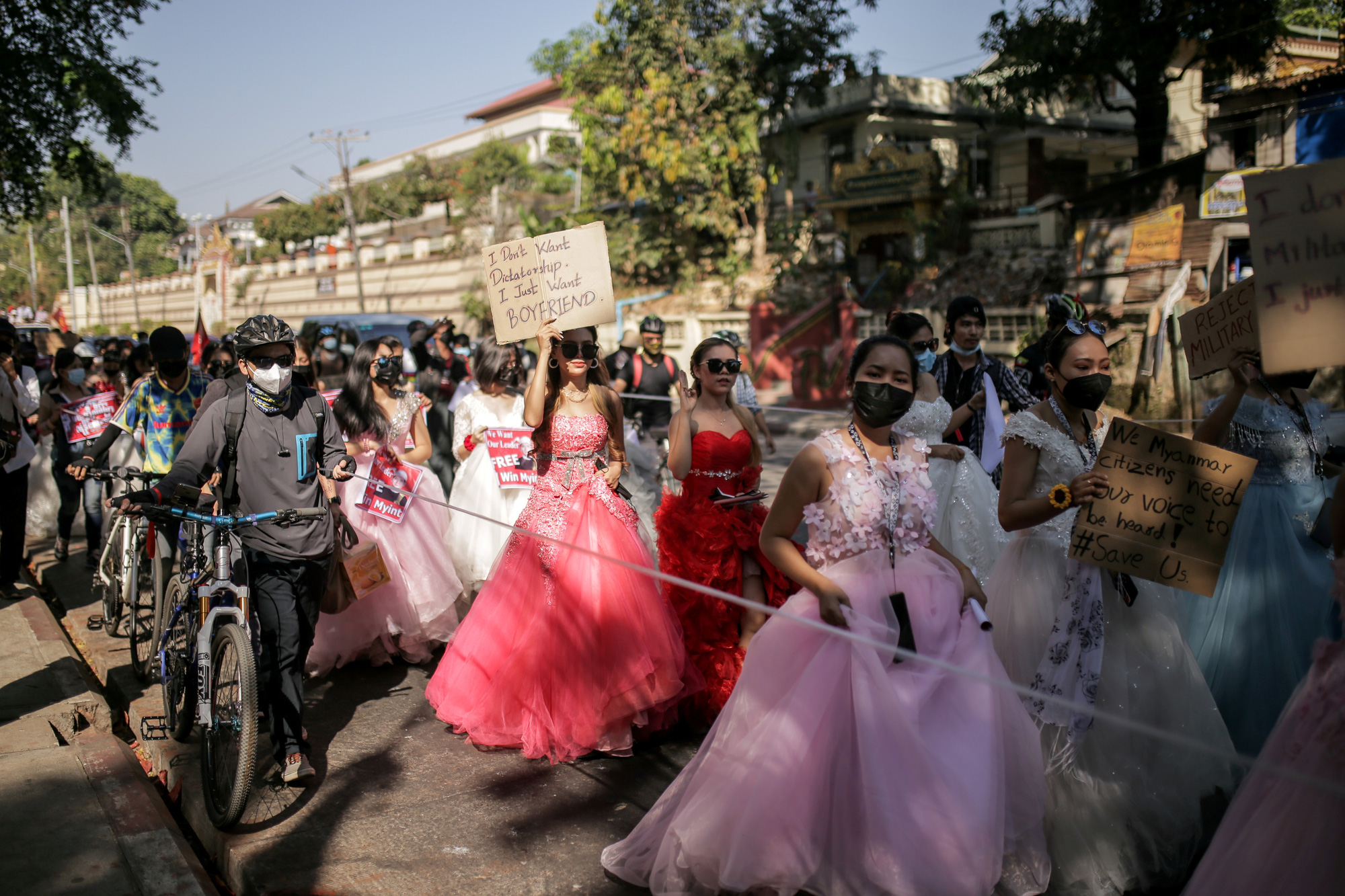 Nhóm người biểu tình mặc váy cưới xuống đường phố Yangon đòi thả bà Aung San Suu Kyi ngày 10-2 - Ảnh: REUTERS